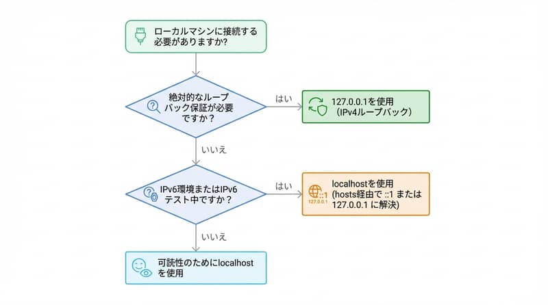 - 迷ったら:「確実に自分のPC内だけ」なら127.0.0.1、「読みやすさ」ならlocalhost。